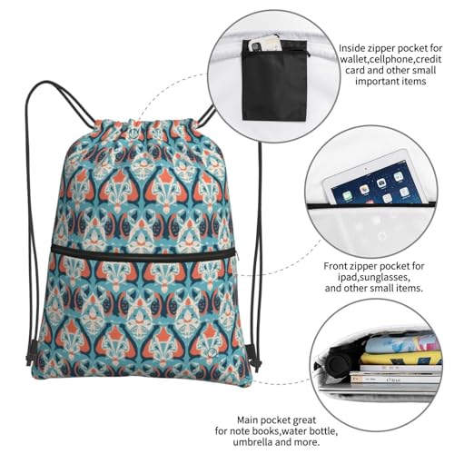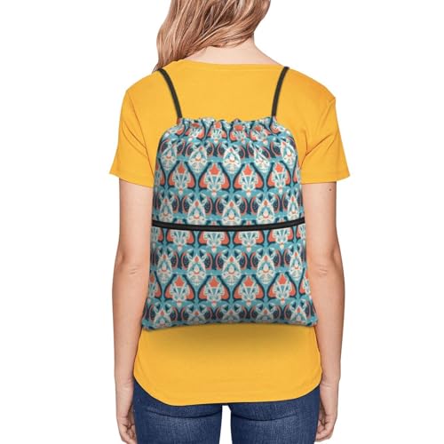Ethnic Pattern Blue Gym Drawstring Bags Dance Bag With Front Zipper Pocket For Yoga 6