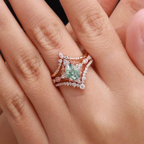 10K 14K 18K Rose Gold 2CT Natural Moss Agate Engagement Ring Set for Women 925 Sterling Silver Genuine Pear Green Moss Agate Leaf Art Deco Bridal Wedding Ring Set (Size 4-15) 7