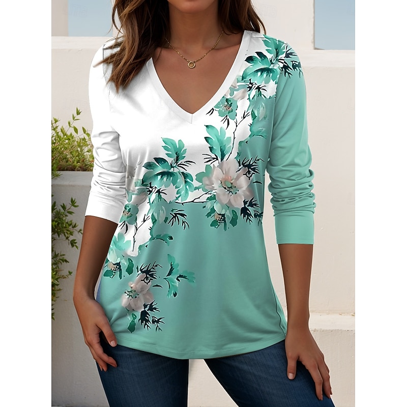 Women's T shirt Long Sleeve V Neck Long Sleeve Tunic Floral Graphic Plants Vintage Stylish Classic Tops Daily Going out Weekend Print Light Green Blue Sky Blue Purple Green Spring Fall Prefall 25