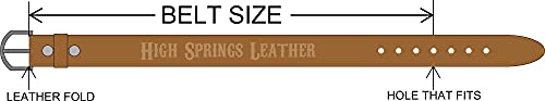 • 1.5 inches wide with 7 holes punched; silver belt buckle and leather keeper included