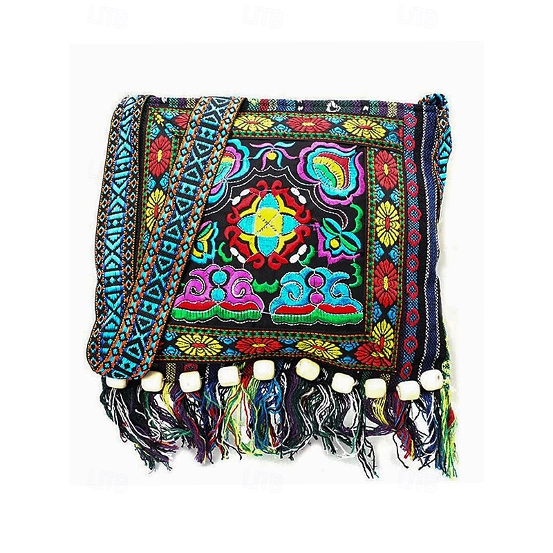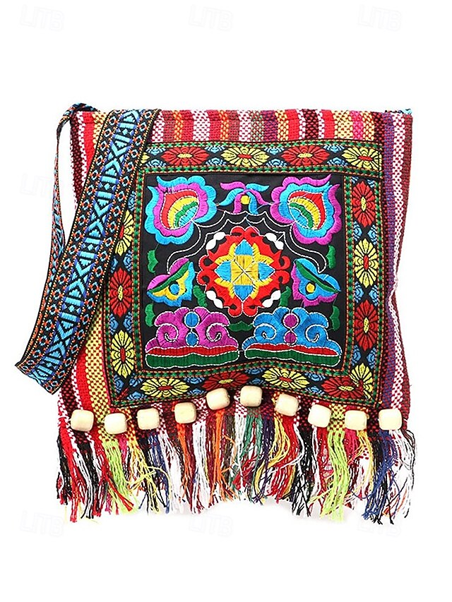 HOT ! Women's Colorful Boho Embroidered Fringe Crossbody Bag – Ethnic Tribal Canvas Shoulder Purse with Tassels and Wooden Beads for Festivals, Travel and Casual Outings