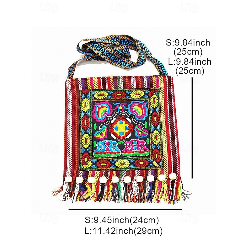 More information about Women's Colorful Boho Embroidered Fringe Crossbody Bag – Ethnic Tribal Canvas Shoulder Purse with Tassels and Wooden Beads for Festivals, Travel and Casual Outings