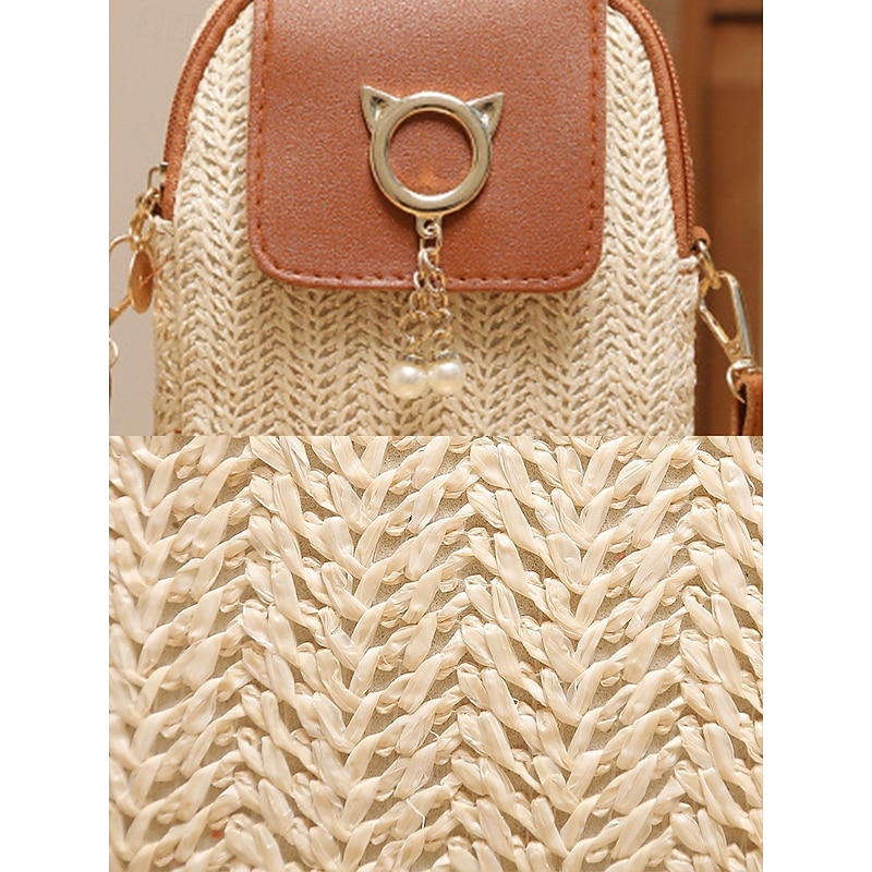 Women's Straw Crossbody Phone Bag with Cat Ears Pendant – Cute Woven Mini Purse, Casual Summer Style, Small Shoulder Bag for Teen Girls & Women, Ideal for Beach, Vacation & Daily Outings 7