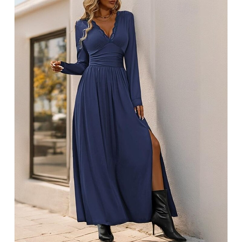 Highlights [Fabric] : Crafted from high-quality polyester, this elegant dress offers a micro-elastic feel that ensures comfort and a graceful fit, making it perfect for the season's changing weather in spring and fall. The fabric drapes beautifully, providing a flowing silhouette that flatters any body type. [Fit] : Designed with a loose fit, this maxi dress allows for ease of movement while retaining its sophisticated and timeless appeal. Its flattering empire waistline is accentuated by gentle ruching that enhances the figure without being overly restrictive. [Design Highlights] : The dress features a chic V-neckline trimmed with delicate lace, adding a touch of femininity and elegance. The long sleeve design offers coverage, while the high slit adds a hint of allure and sophistication. This piece is completed with a subtle split thigh design, perfect for making a stylish statement. [Occasions] : Ideal for a variety of occasions, this versatile dress is suitable for dates, casual street outings, and other events where elegance is key. Pair it with your favorite heels or boots to create a stunning ensemble fit for evenings out and formal gatherings alike. [Size Range] : Available in sizes S, M, L, and XL, catering to a wide range of body types. Choose from classic colors such as black, blue, green, and red to match your personal style and occasion preferences.