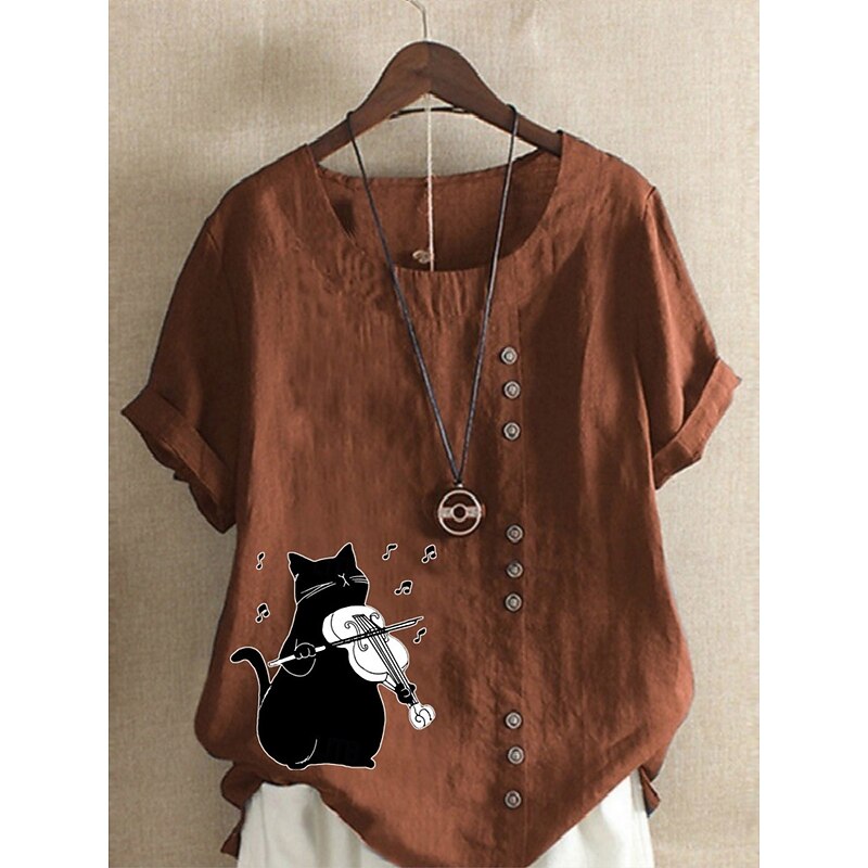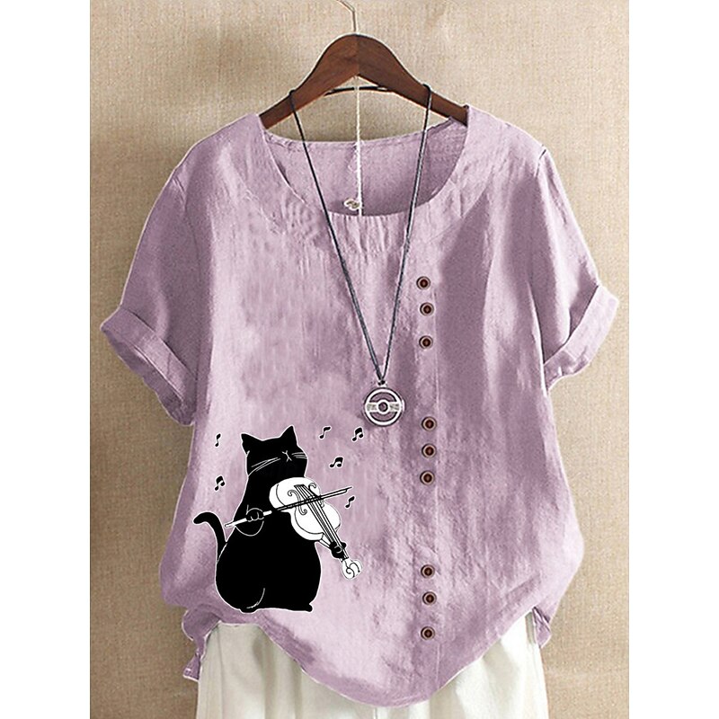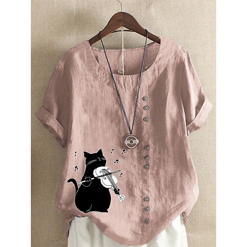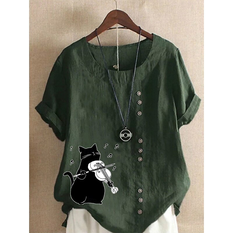 Women's Cotton Linen Shirts Animal Cat Elegant Vintage Tropical Sleeveless Short Sleeve Crew Neck Regular Tops Daily Holiday Vacation Wear Buttons Grass Green White Yellow Pink Army Green Summer 13