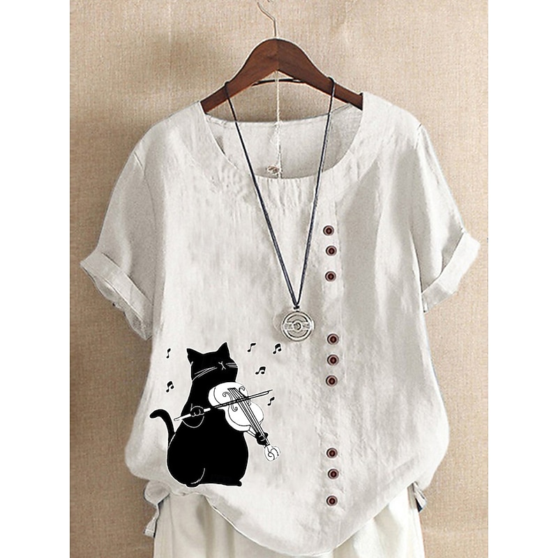 Women's Cotton Linen Shirts Animal Cat Elegant Vintage Tropical Sleeveless Short Sleeve Crew Neck Regular Tops Daily Holiday Vacation Wear Buttons Grass Green White Yellow Pink Army Green Summer 19