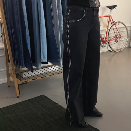 More information about Y2K Studded Jeans for Women Punk Rivet Decorated Denim Pants Grunge 2000s Vintage Low Rise Baggy Fit