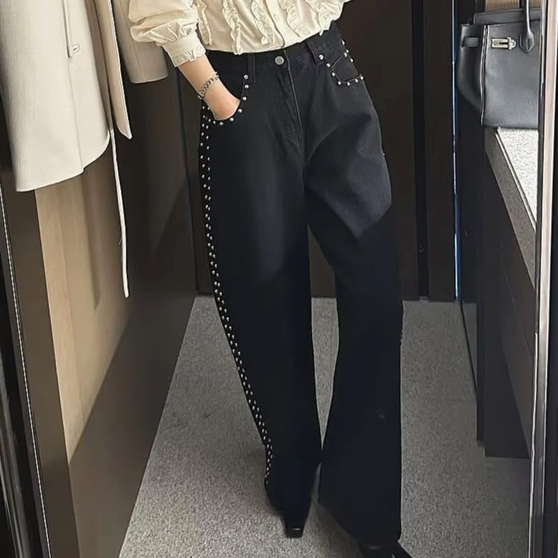 HOT ! Y2K Studded Jeans for Women Punk Rivet Decorated Denim Pants Grunge 2000s Vintage Low Rise Baggy Fit