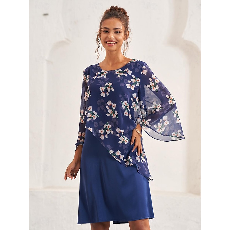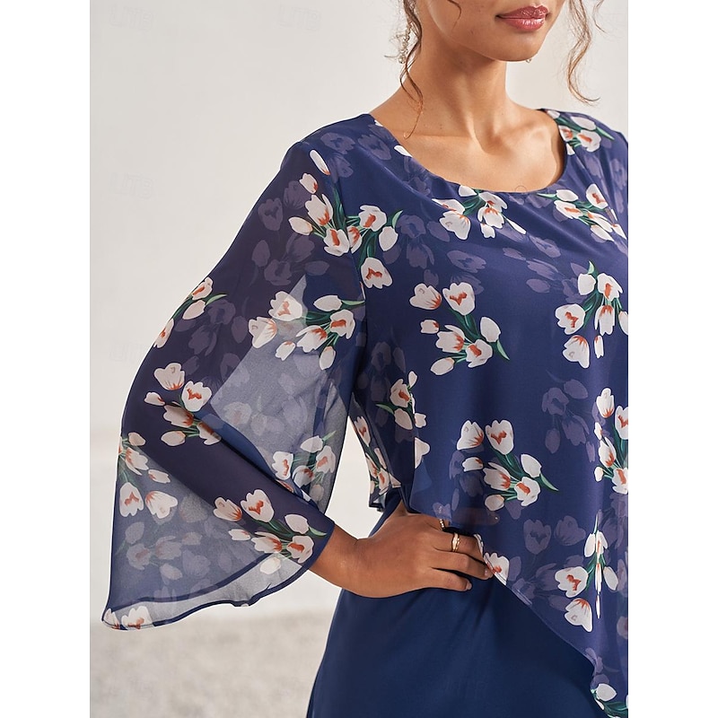 More information about Women's Wedding Guest Dress A Line Dress Elegant Floral Midi Dress Chiffon Flared Sleeve Crew Neck Patchwork Regular Fit Wedding Guest Cocktail Party Blue Summer