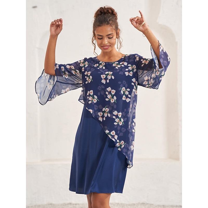 HOT ! Women's Wedding Guest Dress A Line Dress Elegant Floral Midi Dress Chiffon Flared Sleeve Crew Neck Patchwork Regular Fit Wedding Guest Cocktail Party Blue Summer