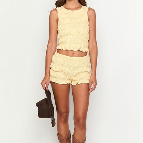 Yuemengxuan Women Two Piece Summer Outfits 2Pcs Pajamas Set Sleeveless Smocked Shirred Tank Top Pleated Shorts Beach Set 2