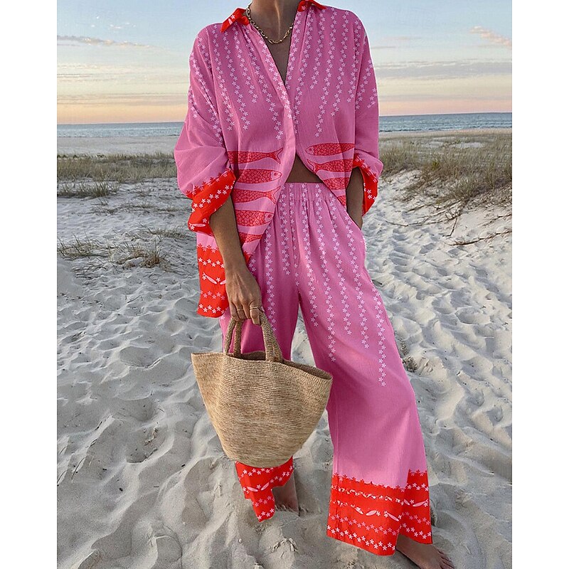 More information about Women's Fashion Streetwear Shirt Cotton Linen Sets Two Piece Sets Linen Pants Pants Trousers Long Sleeve Shirt Collar Color Block Patchwork Daily Wear Date Pink Dark Pink Blue Spring Regular Fit