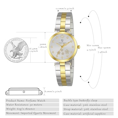 Item width: 4.33 inchesClasp type: Double Locking Foldover ClaspItem type name: Casual Watch【Dual Sensory Luxury Watches】 Experience scent and style with our innovative fragrance-infused timepiece. The built-in mini aromatherapy container releases subtle perfume notes from replaceable pads, this cute women two tone watch creating a lasting olfactory memory that complements its elegant watches diamond-accented design.【Emotion-Engineered Gifting watch】 More than a dainty women watch - a wearable love letter. Ideal for anniversaries, proposals, or meaningful gestures. Every scent release becomes a sensory reminder of your bond, making time itself smell like affection. Ideal gift for girlfriend, wife, mom, grandmother, good friend on birthday, wedding or Mother's Day.【Premium Craftsmanship】 The distinctive scent watch equipped with imported movement super silent when running. featuring scratch-resistant sapphire watch glass, polished 316 stainless steel watch case/band, and shimmering crystal hour markers. Engineered with 3ATM water resistance watches for daily wear. Elegant and delicate cherry blossoms plus a sunray-finished dial for sophisticated readability.【Personalized Fragrance Journey】The two-tone ladies watch includes 3 scent pads + 2 perfume droppers to add different perfume essential oils according to your mood and usage scenario. Let the fragrance always be with you and keep you in a good mood every day.❀Complete Premium Kit❀Presented in gift-ready packaging with bracelet watch band adjustment tools, cleaning cloth, tags, warranty card (3-year coverage,If you have any questions when using DL DreamLegend wrists watch, please feel free to contact us). Hassle-free customization ensures perfect fit for wrist sizes 11-19cm. Perfect for everyday use. top-grade materials and excellent craftsmanship ensure long-lasting durability.