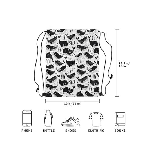 Erosebridal Whale Cartoon Drawstring Backpack 13x15.7, Kawaii Underwater Animals Drawstring Bags, White Black Art Draw String Back Bag, Geometric Hand-Drawn String Backpack 5