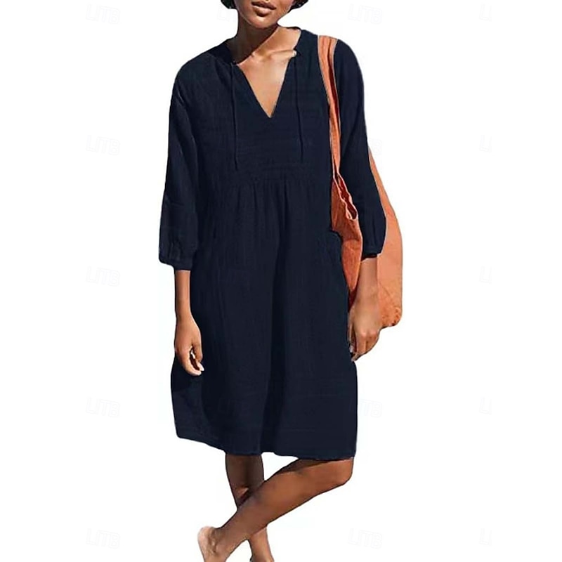 HOT ! Women's Midi Dress Cotton Linen Dresses Casual Dress Basic Casual Vacation Daily Regular Fit Plain 3/4 Length Sleeve V Neck Black White Light Green Light Blue Summer