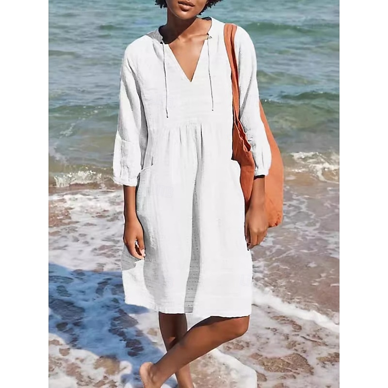 More information about Women's Midi Dress Cotton Linen Dresses Casual Dress Basic Casual Vacation Daily Regular Fit Plain 3/4 Length Sleeve V Neck Black White Light Green Light Blue Summer