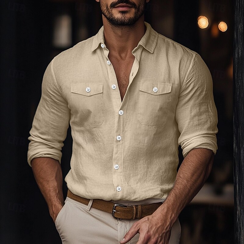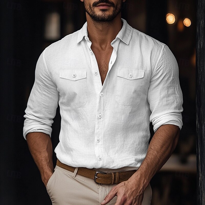 More information about Men's Shirt Linen Shirt Summer Shirt Beach Wear Button Up Shirt Solid Color Vacation Street White Blue Green Khaki Long Sleeve Fold-over Collar Summer Spring Clothing Apparel Pocket
