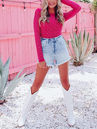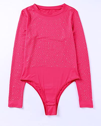 Hotmiss Seamless Long Sleeve Thong Bodysuit for Women Rhinestone Studded Fishnet Tops Thong Shirt