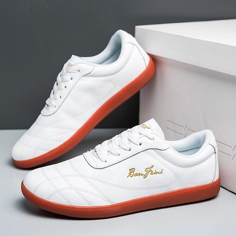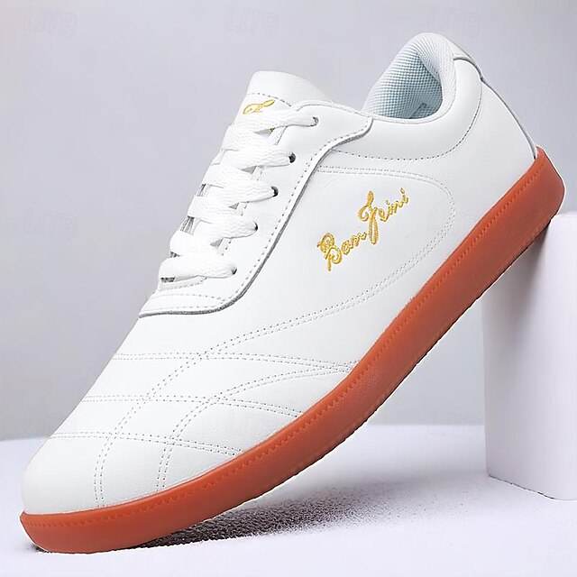Highlights [Fabric and Comfort] : Crafted from high-quality PU leather, these men's white sneakers offer both durability and a sleek appearance. The soft PU lining ensures a comfortable fit, making these shoes perfect for all-day wear. [Design and Silhouette] : Featuring a classic lace-up design, these sneakers provide a secure and adjustable fit, while the round toe shape adds to their timeless style. [Unique Design Elements] : The sneakers feature a bold orange rubber sole, which not only provides excellent traction but also creates a striking contrast with the white upper. The elegant gold-colored logo embroidery on the side adds a touch of sophistication to the overall design. [Occasions and Functionality] : Ideal for casual outings, weekend getaways, or light physical activities, these sneakers offer a blend of style and practical functionality, making them a versatile choice for any active lifestyle. [Size Range] : Available in a range of sizes, including US7 to US10.5, these sneakers cater to a variety of foot sizes, ensuring a perfect fit for every wearer.
