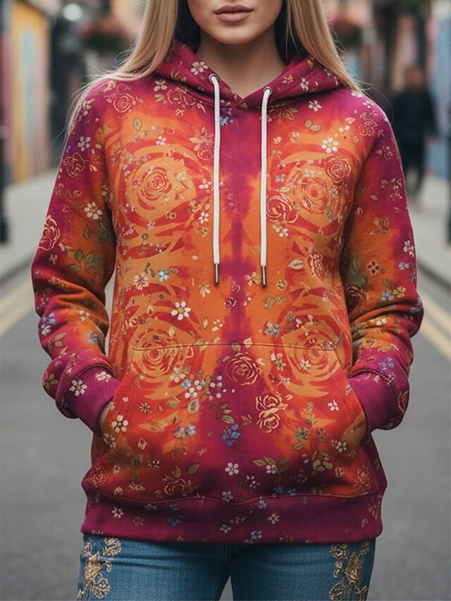 Women's Pullover Hoodies Rose Fashion Streetwear Casual Long Sleeve Hooded Regular Tops Dailywear Casual Sports Drawstring Pocket Print Red Fuchsia Spring Fall