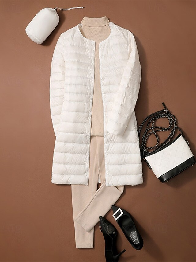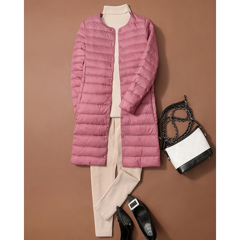Women's Down Jacket Coat Warm Comfortable Buttons Casual Plain Outdoor Vacation Street Single Breasted Long Crewneck Regular Fit Long Sleeve Outerwear Black White Pink Fall Winter 10