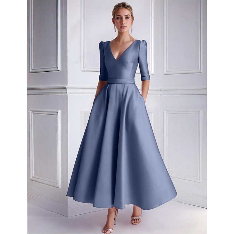 A-Line Wedding Guest Dress Cocktail Dresses Beach Wedding Elegant Dress Formal Wedding Guest Tea Length Half Sleeve V Neck Satin with Pocket Dresses 12
