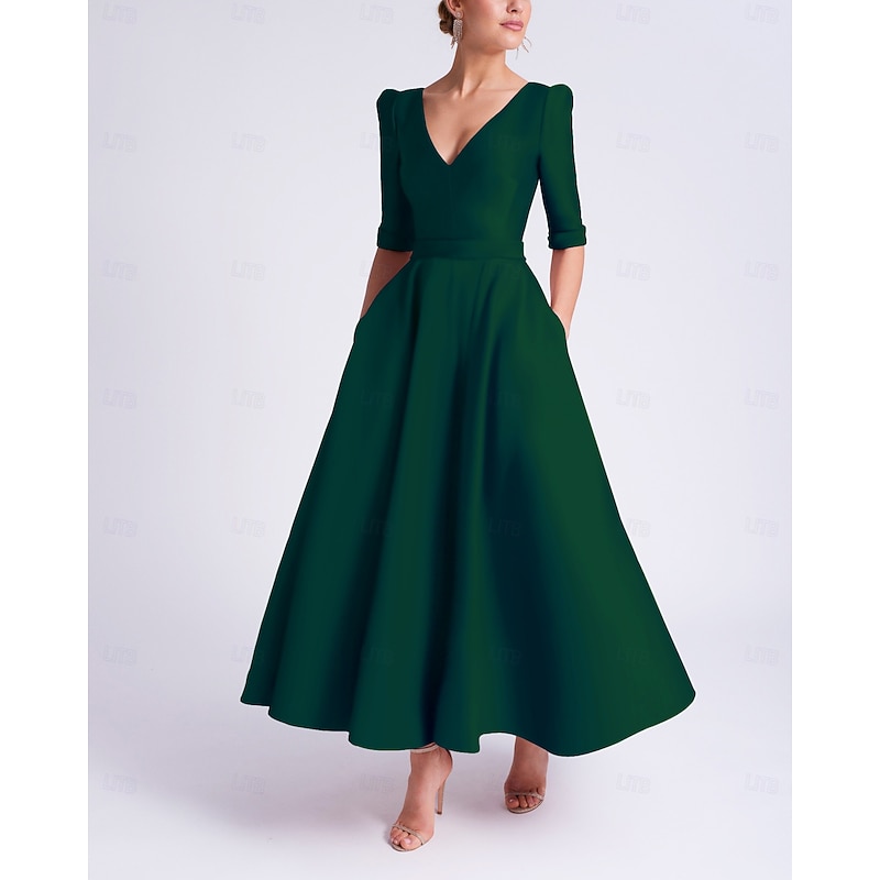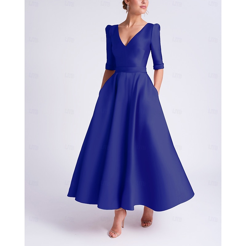 A-Line Wedding Guest Dress Cocktail Dresses Beach Wedding Elegant Dress Formal Wedding Guest Tea Length Half Sleeve V Neck Satin with Pocket Dresses 6