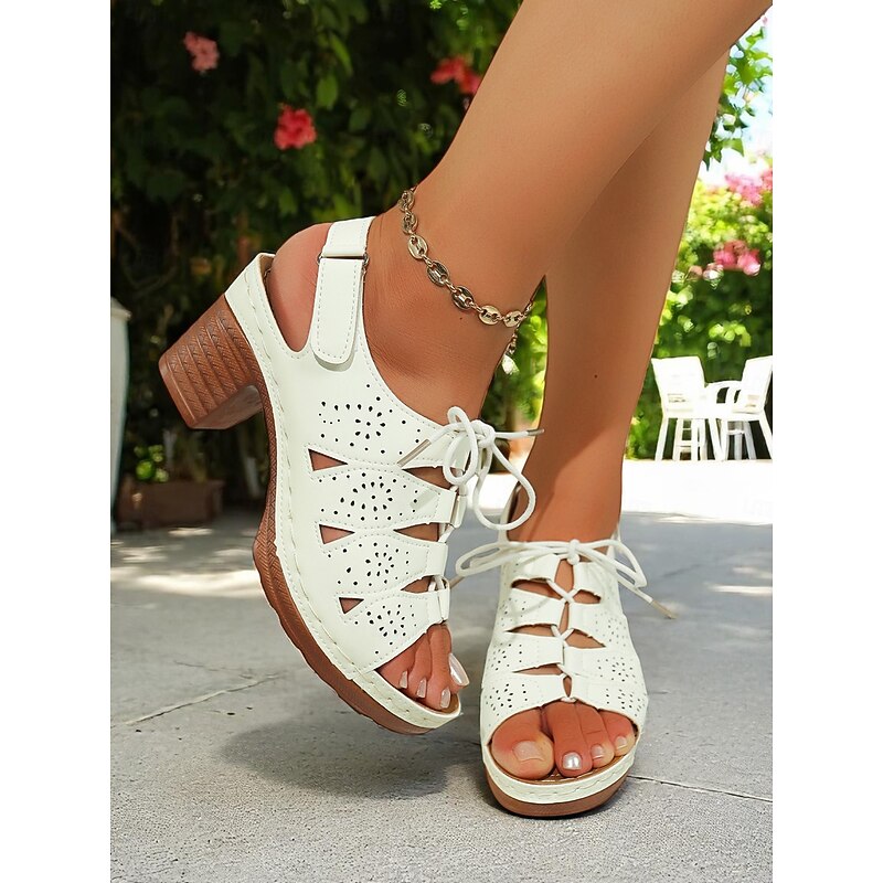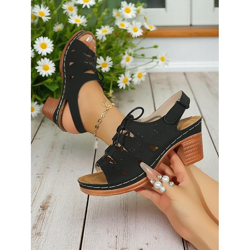Women's Cut-Out Chunky Heel Sandals – Retro Lace-Up Design with Cushioned Insole, Ideal for Shopping, Outdoor Festivals and Summer Brunch 1
