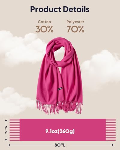 • 【Softness】This scarf is large, warm, lightweight and soft. 80" long (74" + 3" tassels on each side), 27" wide, and weighs 9.1 oz. Still soft after many washes.