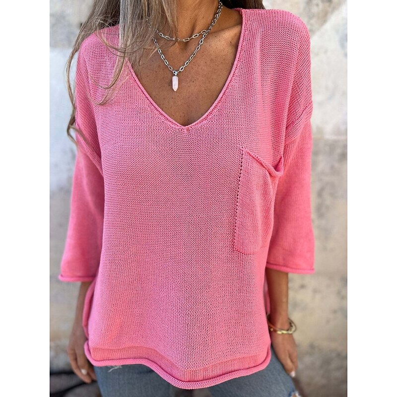 Highlights - Perfect for spring, summer, and fall - Made with high-quality cotton fabric - Features long sleeves for added comfort - Designed for women who appreciate stylish and casual looks - Ideal for daily wear - Classic sweater style with a regular fit - Solid color pattern with a trendy pocket detail - V-neckline adds a touch of elegance - Ribbed knit style for added texture and visual interest
