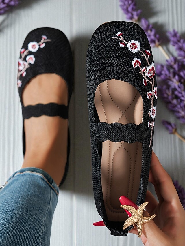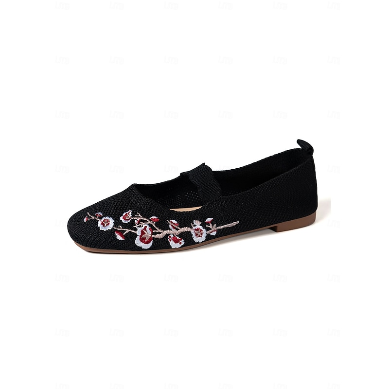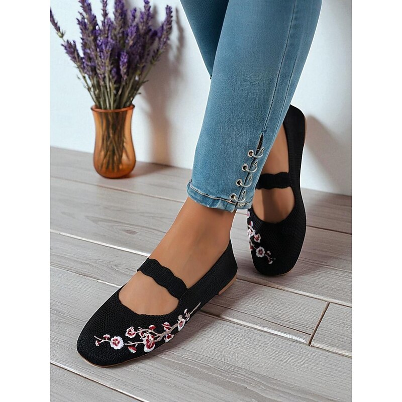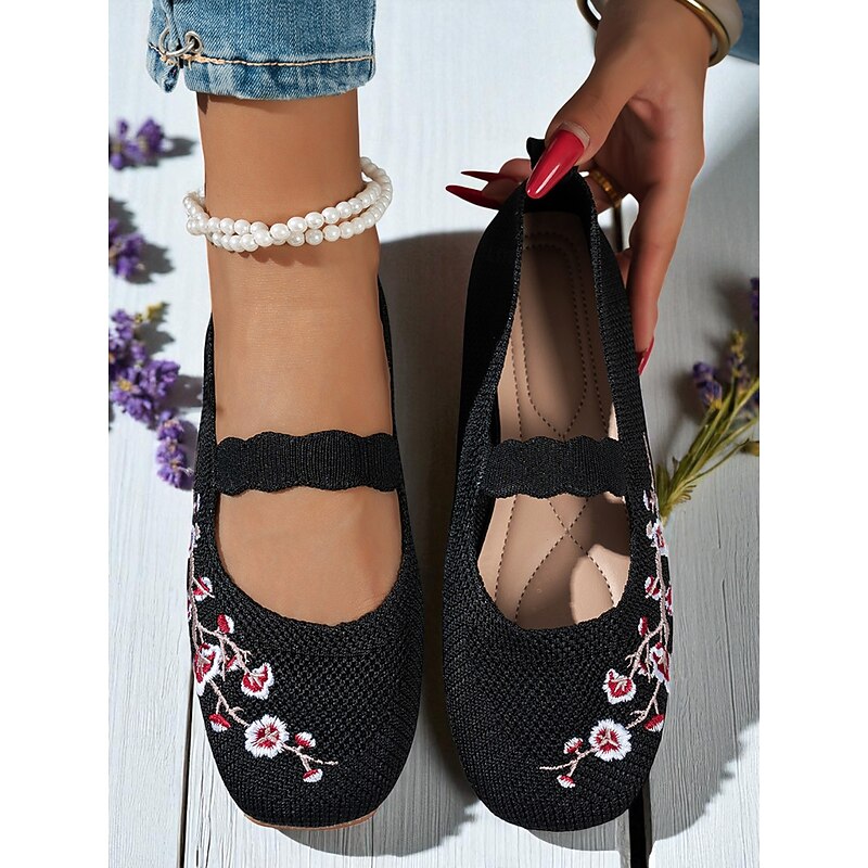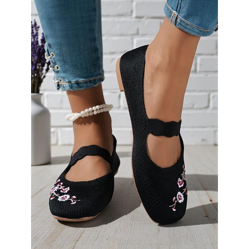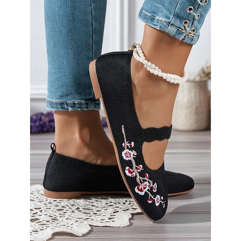 HOT ! Women's Beige Flyknit Mary Jane Flats with Floral Embroidered, Casual Breathable Slip-On Shoes for Work, Travel and Daily Wear