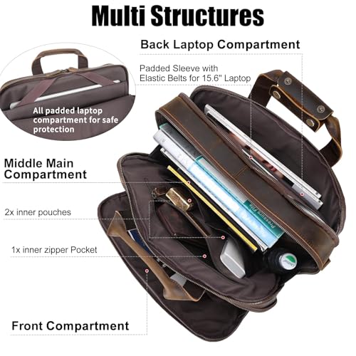 • 【Sturdy Briefcase Bag】The 15.6 inch laptop bag for men is made of 2mm thick premium full grain leather, outfitted with YKK zippers, heavy duty hardware, tear-resistant liner and handcrafted by skilled artisans. It’s built to last for decades. The leather is processed with crazy horse leather tech to increase durability, forming a distinctive rough weathered look as it’s recent, but keeping the original pores and texture of cowhide.