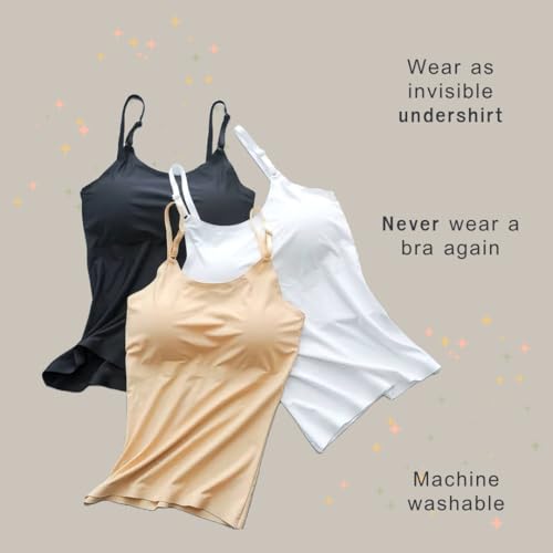 • PADDED CAMISOLE WITHOUT SHELF BRA, NO BRA TANK TOP – Simple padded tank top without the typical “built-in bra” and uncomfortable elastic band around your rib cage. Has no “shelf bra” like found in most cami bra tops – just light padding via soft cup insert for nipple coverage and attractive shape. Never wear a bra again!