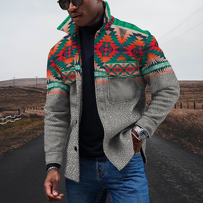 Men's Geometric Tribal Ethnic Collared Shirt Shirt Jacket Overshirt Long Sleeve Vintage Streetwear Ethnic Style Outdoor Daily Going out Summer Spring Turndown Pocket Print Yellow Pink Blue Purple