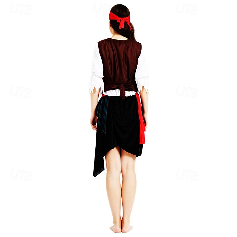 Highlights [Fabric] : The costumes are crafted from a comfortable and durable polyester material, ensuring they are suitable for extended wear during events. The fabric's quality ensures ease of movement, making them perfect for lively celebrations. [Fit] : The men's costume features a relaxed fit with a classic white blouse and dark brown vest, while the women's ensemble boasts a flattering off-shoulder blouse paired with a corset-style vest to enhance the silhouette. Both outfits are designed to provide a stylish and comfortable fit for wearers. [Design Highlights] : The men's costume is accentuated by a bold red sash and bandana, with traditional black pants to complete the look. The women's outfit dazzles with a dynamic mix of textures and colors, featuring billowing sleeves and a skirt that incorporates elements of red, orange, and dark brown fabrics. A matching bandana and knee-high black boots reinforce the daring pirate theme. [Occasions] : These pirate-themed costumes are ideal for Halloween, Carnival, and masquerade events. They are perfect for themed parties or any occasion where a touch of adventurous flair is desired. [Size Range] : The costumes are available in a standard one size, designed for both men and women, accommodating a wide range of adult wearers.