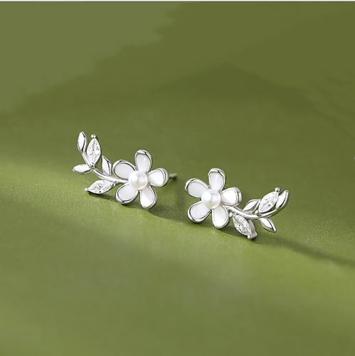 Reffeer Solid 925 Sterling Silver Flower Stud Earrings for Women Teen Girls CZ Leaf Post Stud Earrings Pearl Flower Studs 1