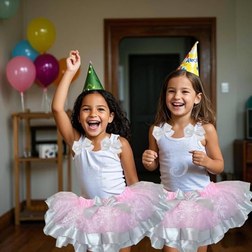 • 【Design Highlights】Two layers soft pink tulle tutu with beautiful silver bow at the waist and three cute snowflakes at the front of skirt. Elastic waist wrapped in smooth satin fabric, adjustable 19" relaxed to 23" fully stretched fits growing kids, tutu length 9". We recommend wearing something underneath like leggings or bloomers. Layered, floaty design, twirl ready for party fun!
