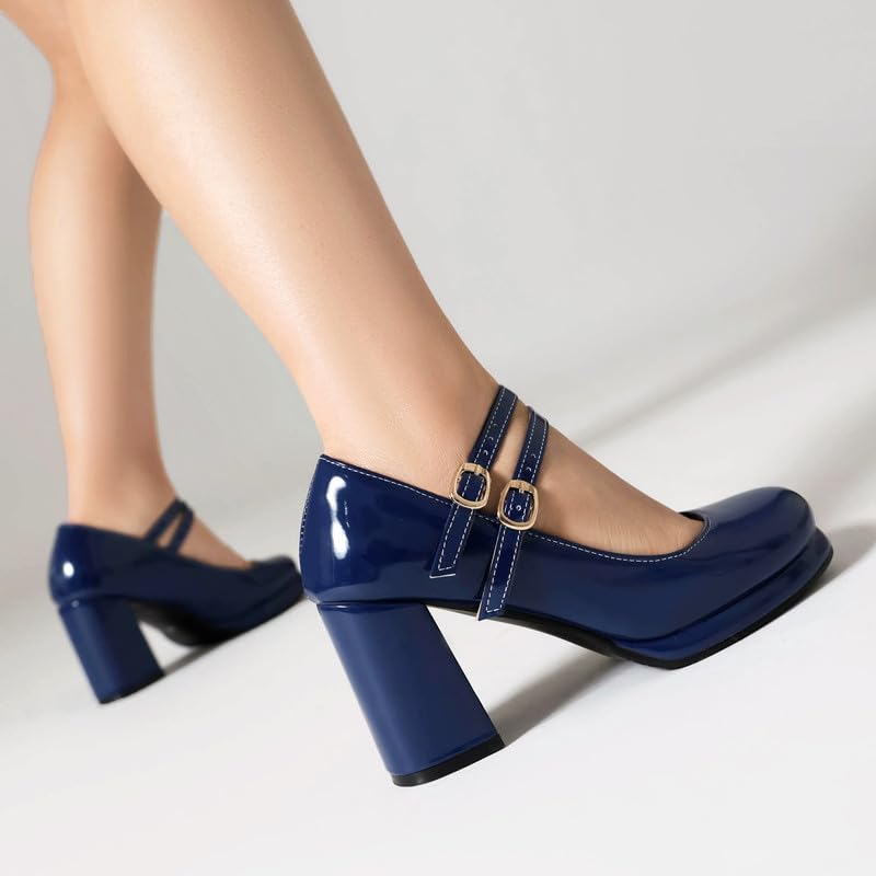 Women's Chunky Heels Platform Mary Janes Square Toe Pumps 3 Strap Patent Leather Block High Heel Dress Shoes 5