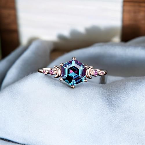 Alexandrite Engagement Ring for Women - Hexagon Cut Alexandrite with Amethyst Accents - Rose Gold Plated Celestial Moon & Star Ring - Vintage Handmade Jewelry Gift for Anniversary, Birthday, Wedding
