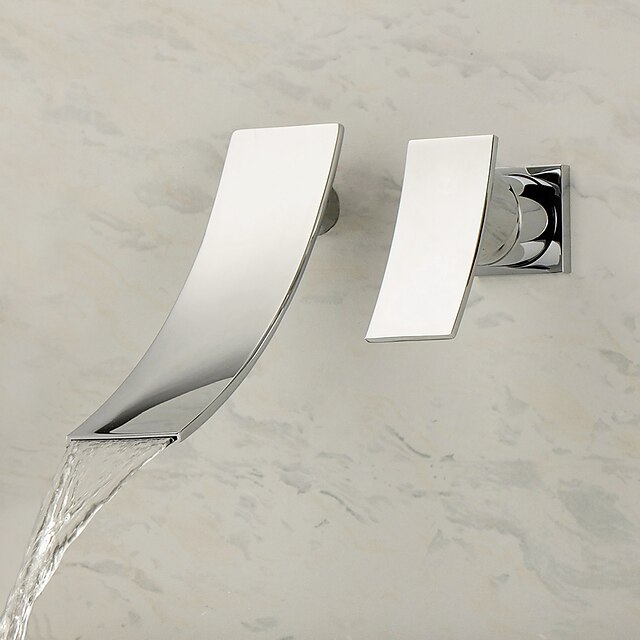 HOT ! Bathroom Sink Faucet,Modern Style Stainless Steel Slide Shape Design Wall Mount Waterfall Chrome Single Handle Two Holes Bath Taps with Hot and Cold Switch and Valve