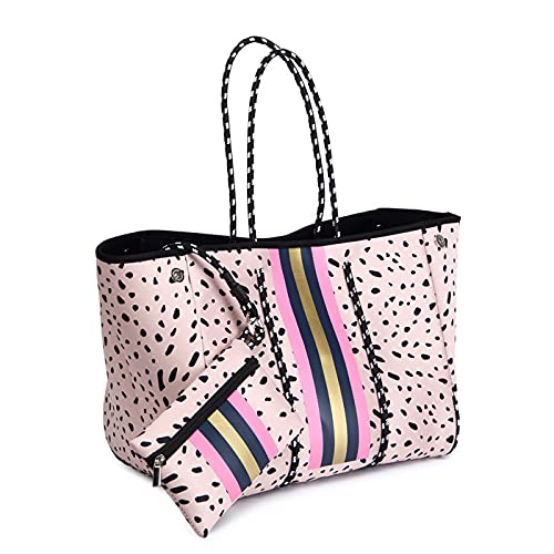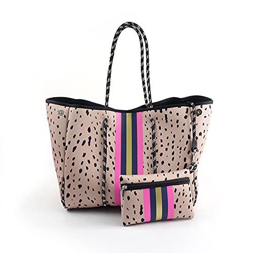 HOT ! Leopard Neoprene Tote | Beach Tote, Gym Bag | Matching Zipper Pouch Included | Tan with Black Dots Design