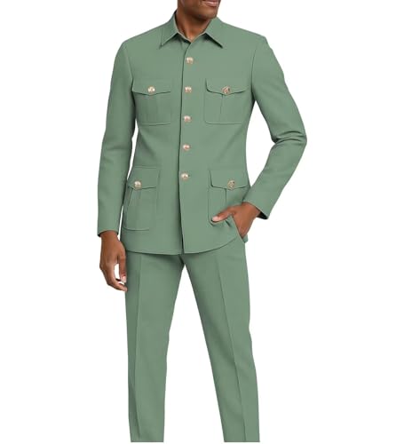 Mens 2 Piece Safari Suits Stand Collar Formal Suit Regular Fit Suit Jacket Multi Pocket Blazer Pants Set for Men 2