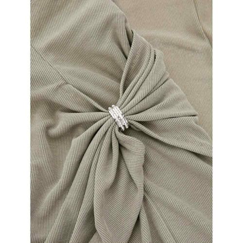 • Mini drap skirt featuring shirring details across the waistline, mid rise, a slit at the side, and a jewel crystal ring at waist