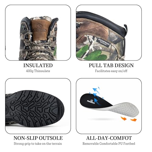 • LIGHTWEIGHT and INSULATED: The camouflage pattern is well-executed, blending in with natural environments and effectively concealing dirt.The hiking boots is lightweight, and the 200G 3M Thinsulate insulation is a standout for cold conditions, promising warmth without the bulk.