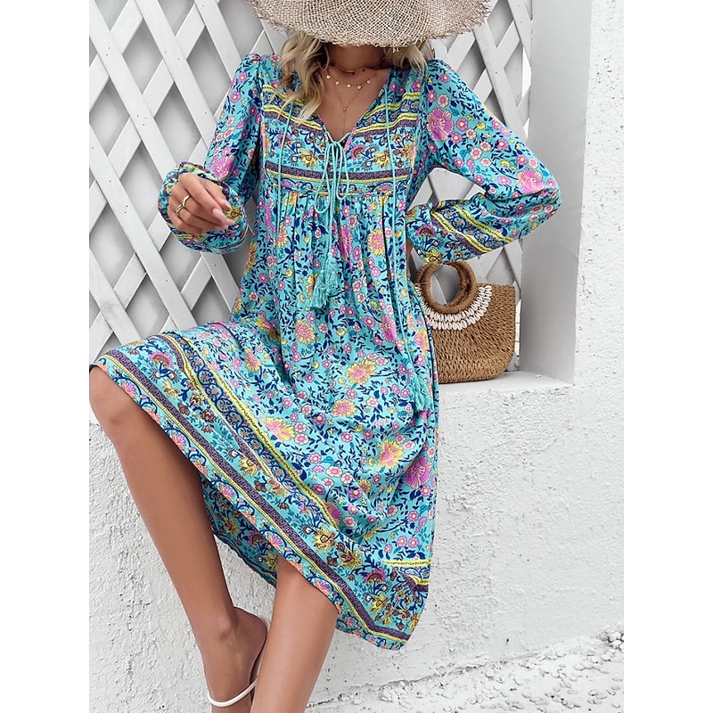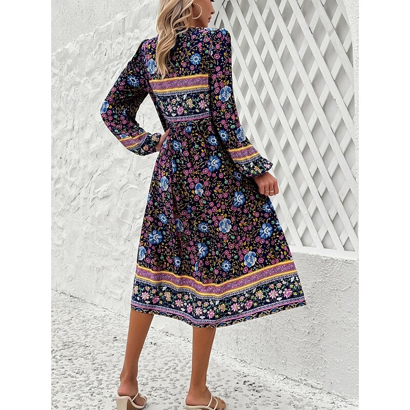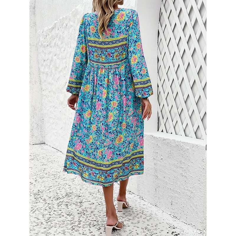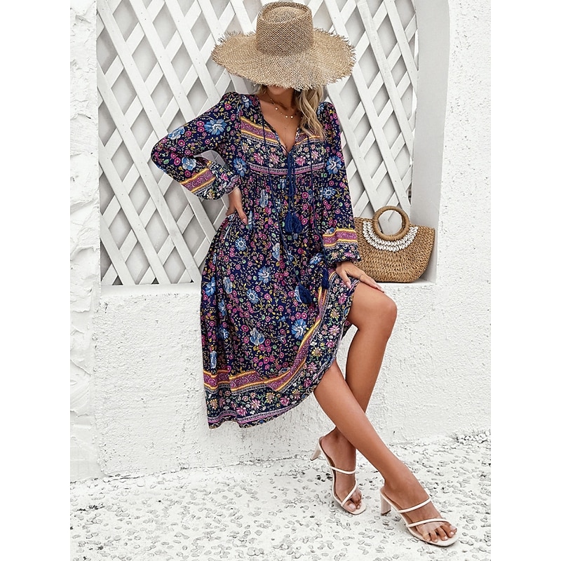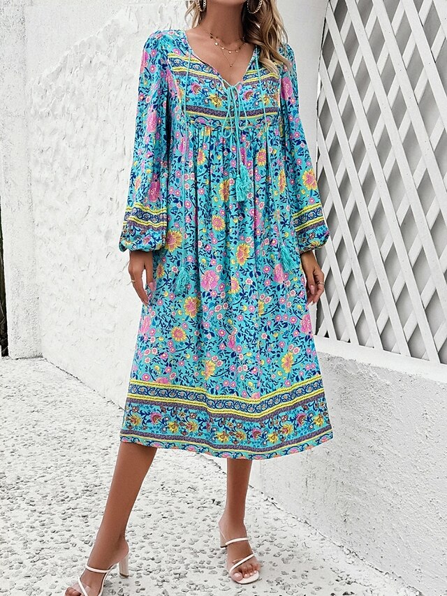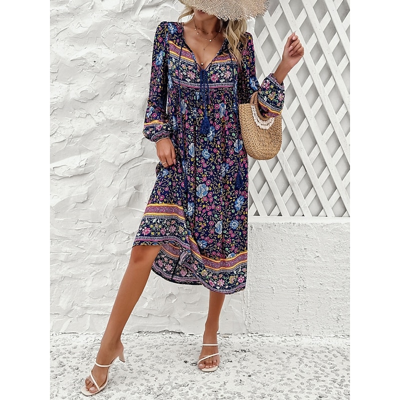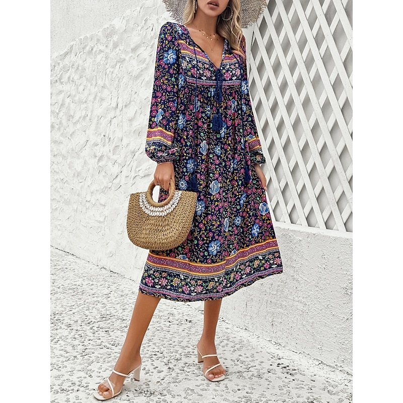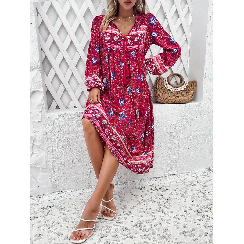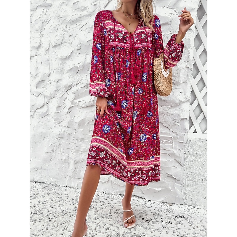 More information about Women's Midi Dress Casual Dress Swing Dress A Line Dress Boho Dress Bohemia Vintage Casual Vacation Daily Regular Fit Floral Long Sleeve V Neck Red Navy Blue Blue Spring Fall