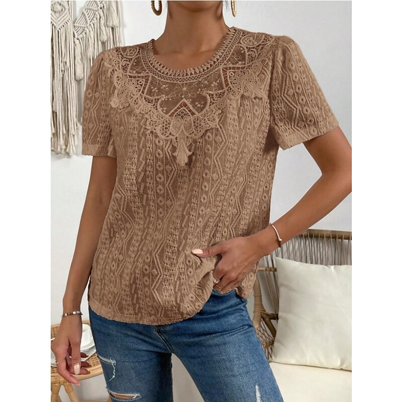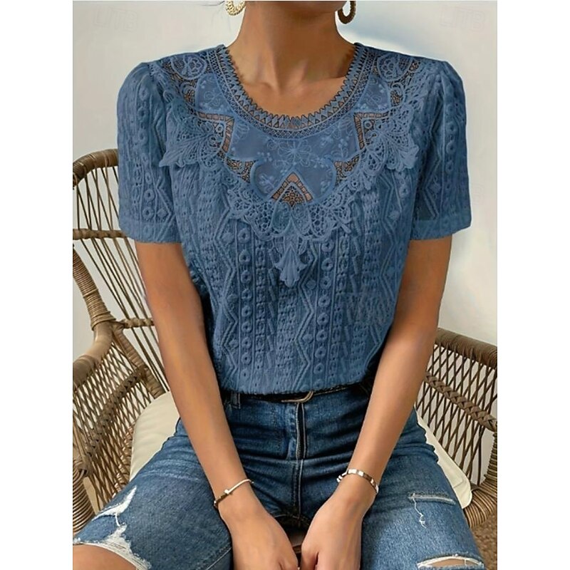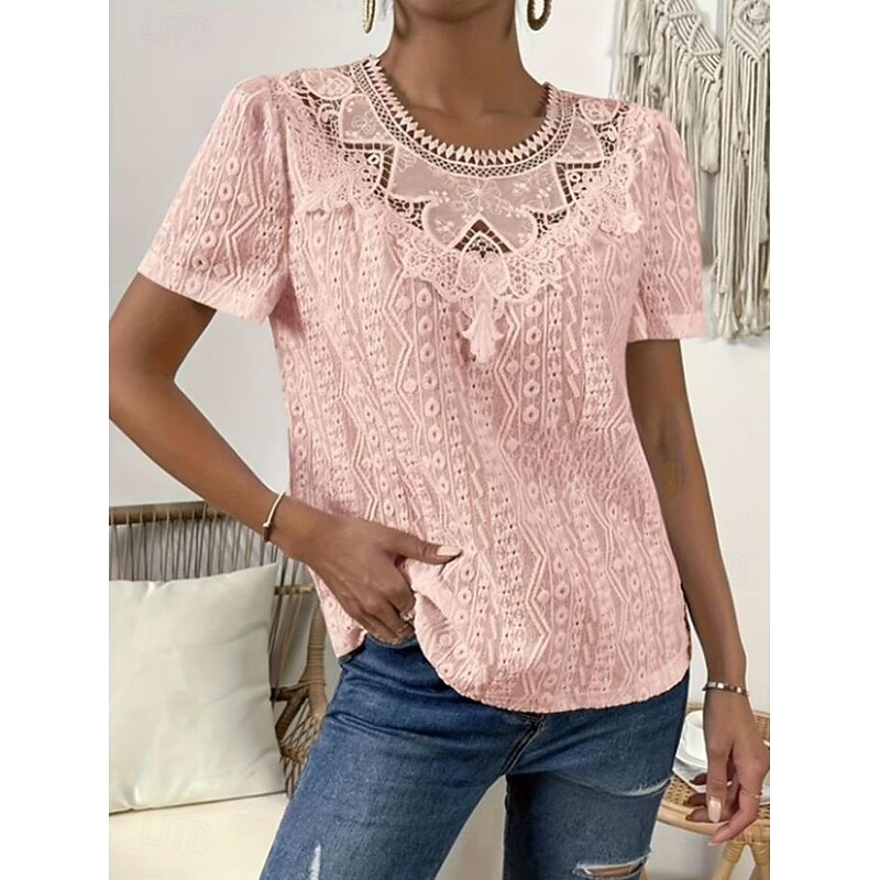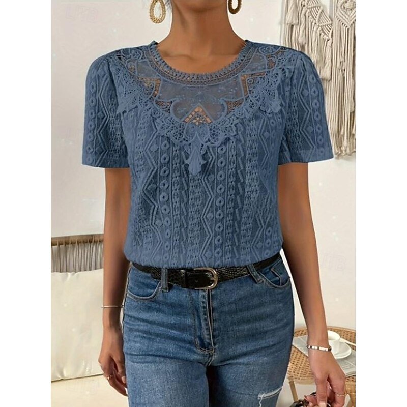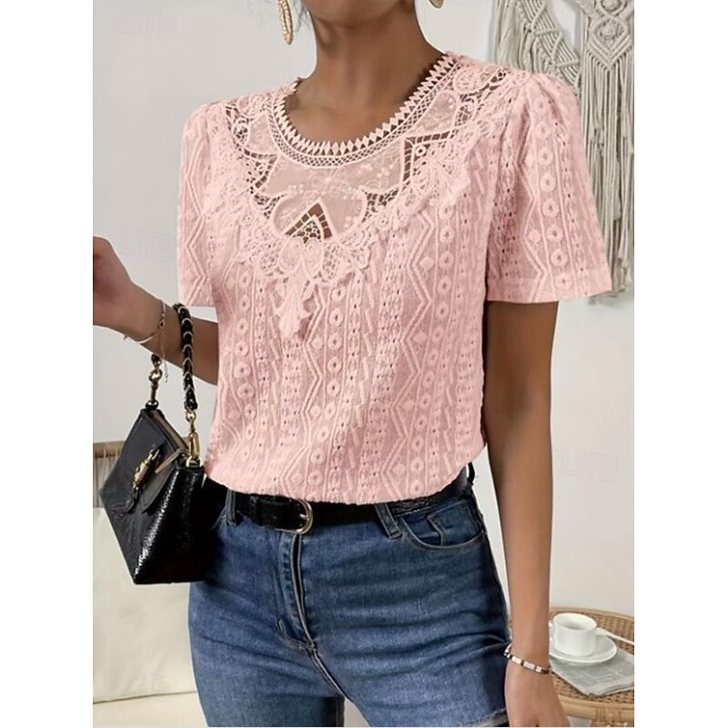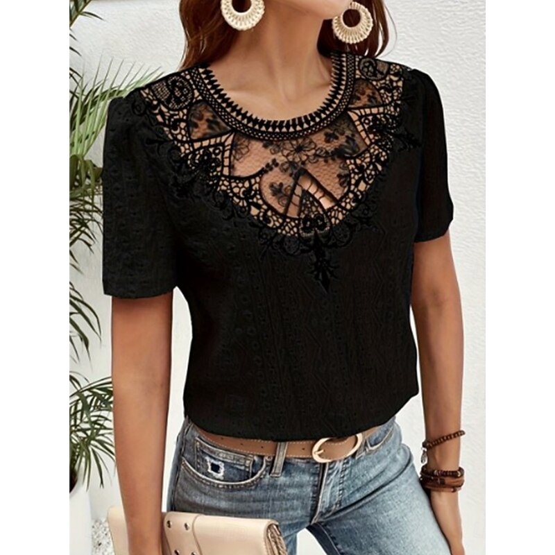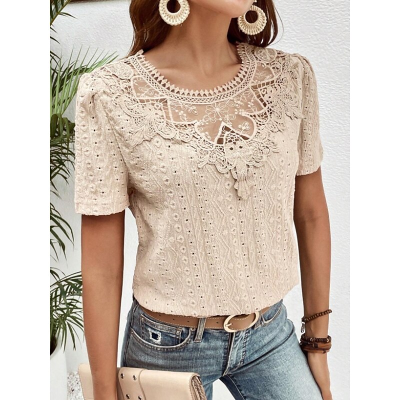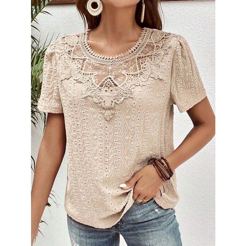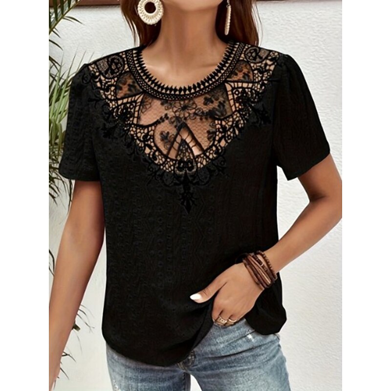 HOT ! Women's T Shirt Plain Fashion Modern Casual Short Sleeve Crew Neck Regular Tops Daily Weekend Lace Patchwork Black White Pink Blue Khaki Summer