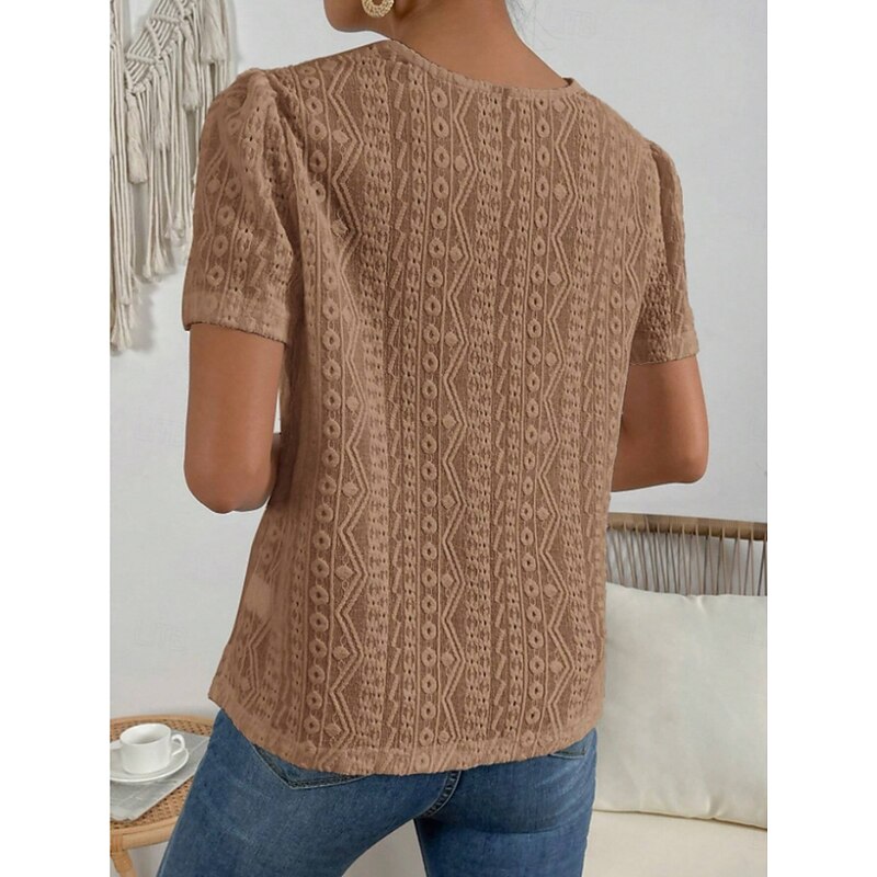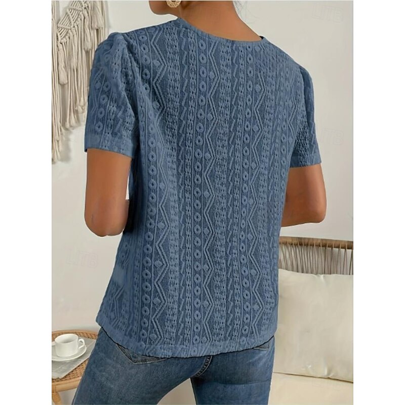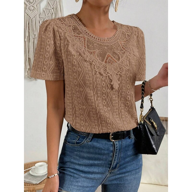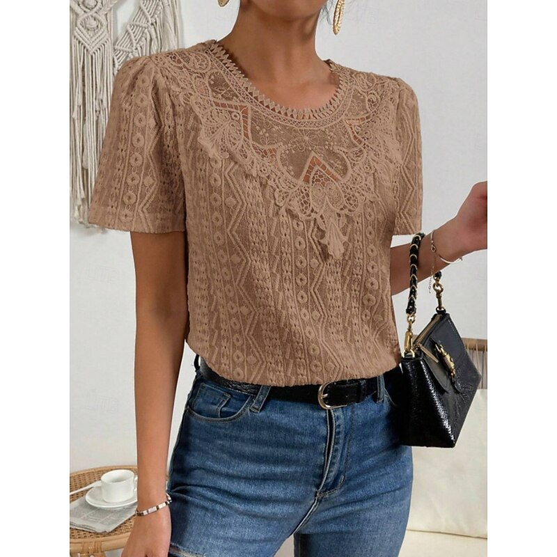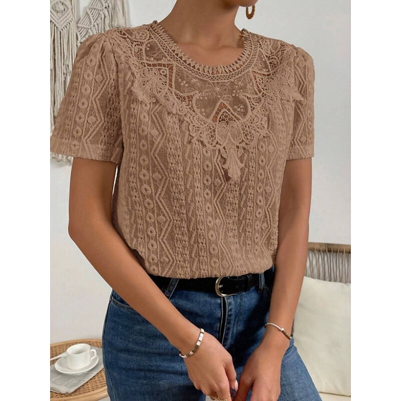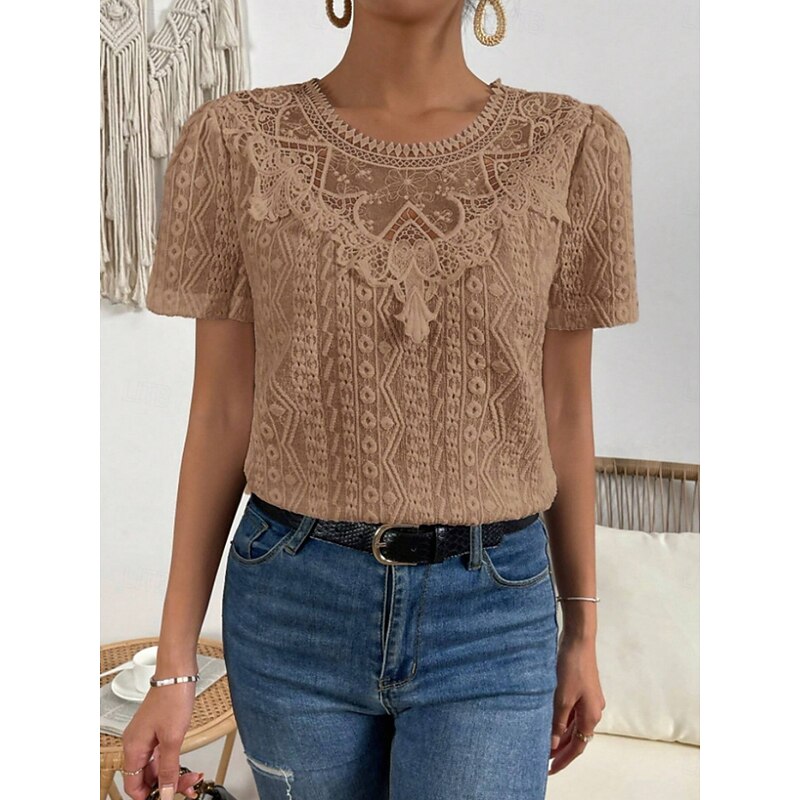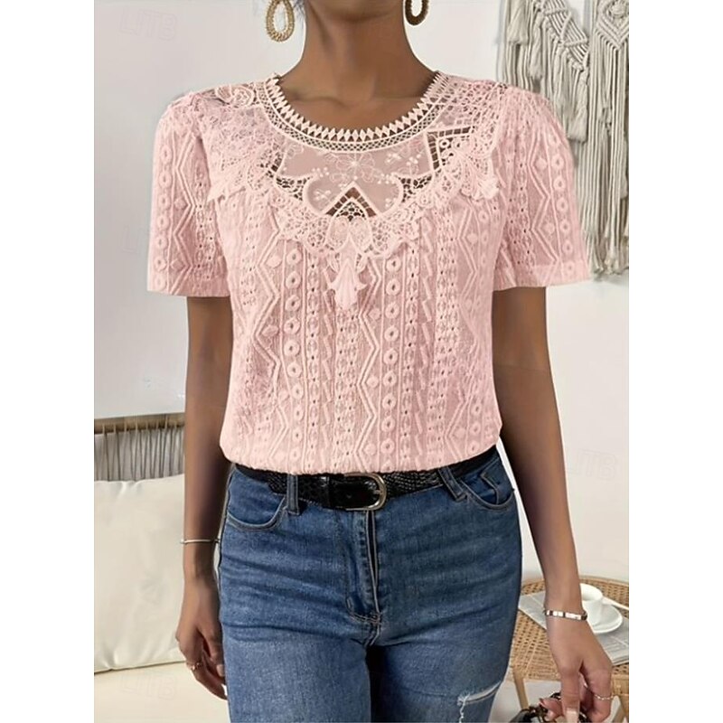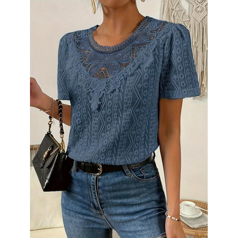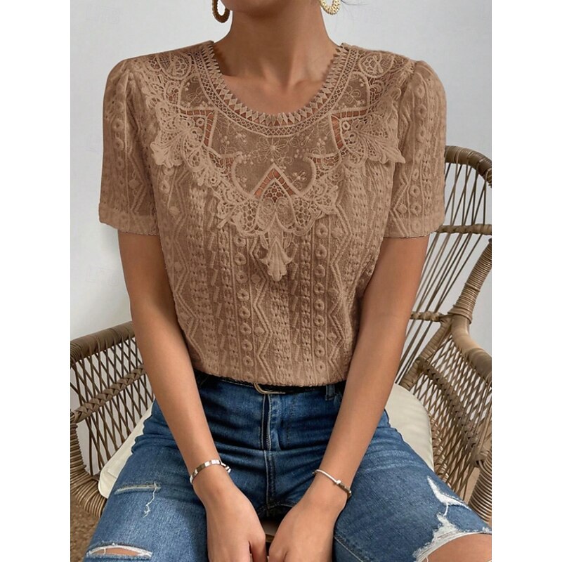 HOT ! Women's T Shirt Plain Fashion Modern Casual Short Sleeve Crew Neck Regular Tops Daily Weekend Lace Patchwork Black White Pink Blue Khaki Summer