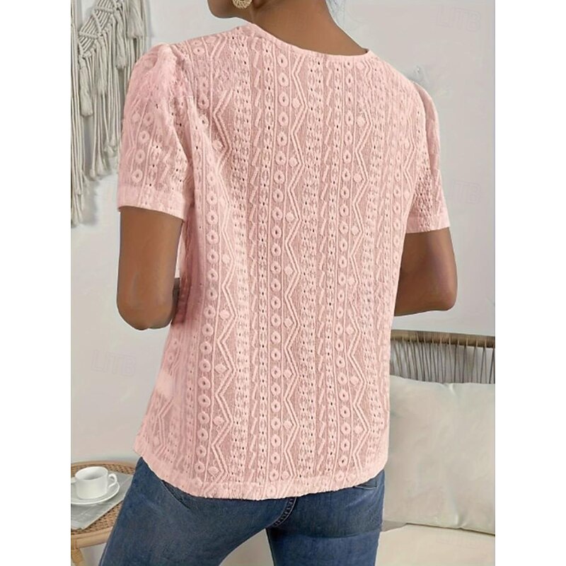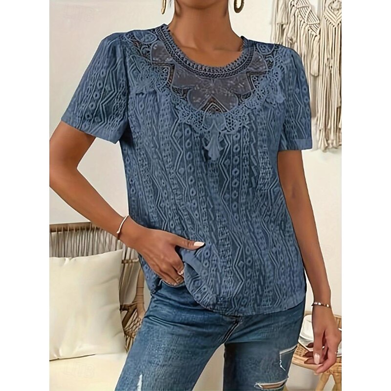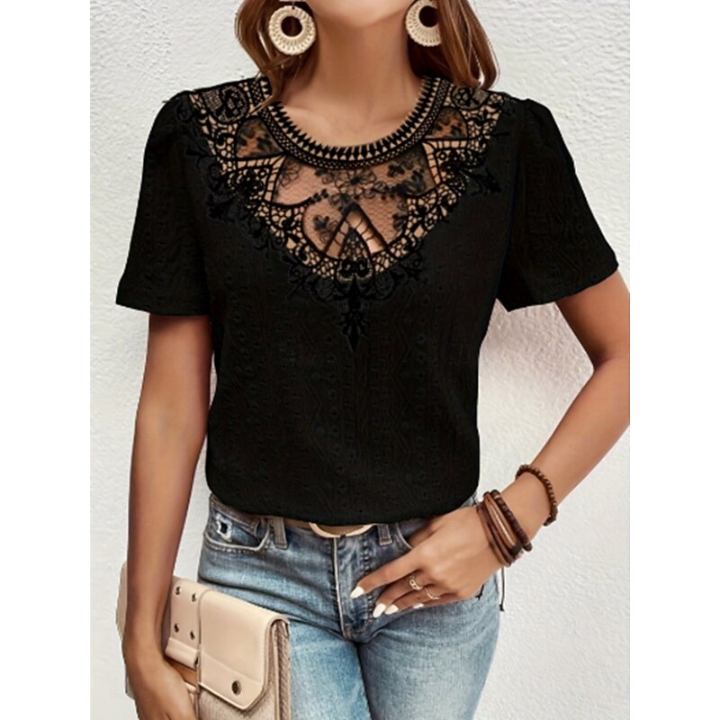 Women's T Shirt Plain Fashion Modern Casual Short Sleeve Crew Neck Regular Tops Daily Weekend Lace Patchwork Black White Pink Blue Khaki Summer 24