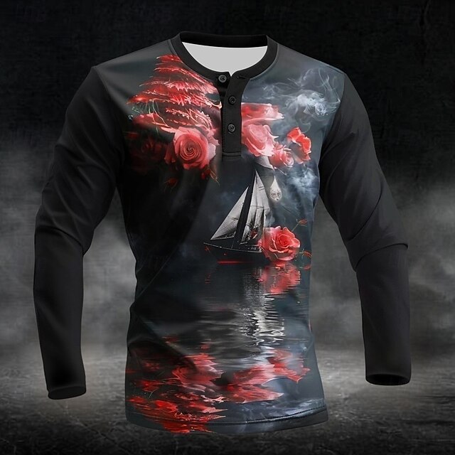More information about Men's Day of the Dead Graphic Sailboat Rose Henley Shirt Long Sleeve Fashion Cute Daily Casual Holiday Going out Fall Spring & Fall Black Henley Henley T-Shirt