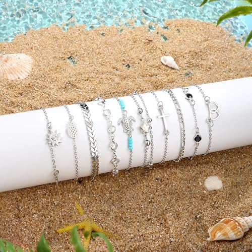 FASACCO 20Pcs Ankle Bracelets for Women Adjustable Beach Anklet Set Surfer Anklet Heart Star Turtle Infinite Anklets Foot Jewelry